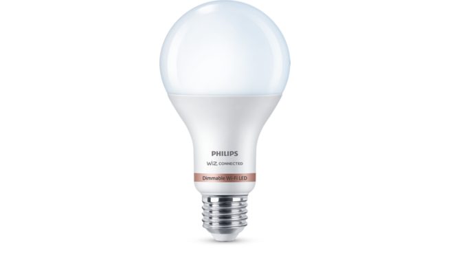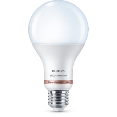 Dim the lights without installing a dimmer with the Philips Wi-Fi Smart Dimmable Cool White A21 bulb. Use the WiZ app or your voice to get preset light scenes and more. Philips Wi-Fi bulbs are WiZ-connected. Not compatible with Philips Hue.